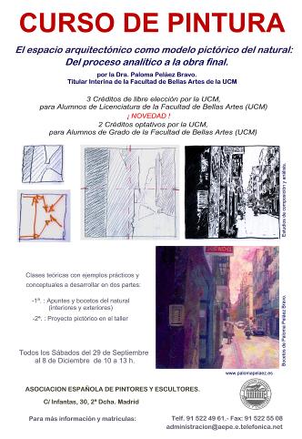 El curso tiene como fundamento principal considerar la arquitectura desde el lenguaje de la pintura. Para ello se tomará como punto de referencia y estudio el edificio de la Calle Infantas nº30, (sede de la AEPE) tanto de sus interiores (portal, patios, dependencias…) como exterior y entorno. El espacio arquitectónico será estudiado y observado a través de prácticas del natural para su posterior desarrollo en un proyecto pictórico. El curso está enfocado para que el alumno aplique de forma más específica los conocimientos teórico-prácticos basados en el estudio del natural y su traducción cromática necesarios para desarrollar el proceso pictórico. Dado el interés y amplia participación de alumnos en la edición pasada -en la cual muchos quedaron en lista de espera al llenarse dicho curso- hemos visto necesario volver a introducir esta actividad didáctica. Desde una base teórica y práctica, se irán planteando diversas claves esenciales para la selección, análisis y organización del natural. También se visualizarán diferentes estudios clásicos y contemporáneos que permitan ampliar al alumno sus conocimientos en el marco de la composición plástica en aras de un buen resultado pictórico. El conjunto de prácticas se dividirán en dos partes:
